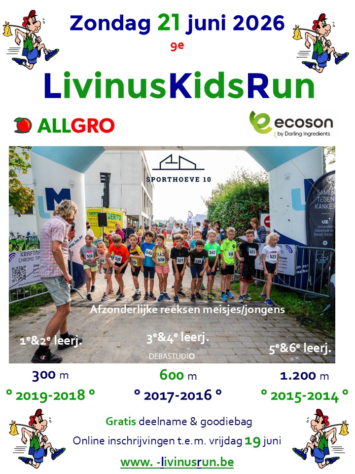 KidsRun 1e reeks (1200 m): start 9u20 Andere reeksen volgen na afloop van vorige reeksen. Afhalen borstnummers tussen 8u45 en 9u15 op startlocatie. Vanaf 1 april tem vrijdag 26 juni 2026! PodiumPrijzen 18 Fruitdozen 5 kg!